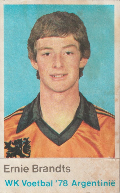 Origineel voetbalplaatje van het merk Inter Footbal uitgegeven door Kortekaas Merchandising BV in 1977. Betreft plaatje van Ernie Brandts van het Nederlands Elftal voor het WK 1978.
