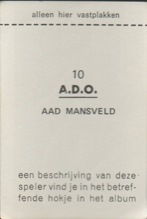 Vanderhout Voetbalsterren in Aktie 1970/1971Type: Base Plaatje#10: Aad Mansveld (A.D.O.)Staat: Nooit ingeplakt geweest (zie foto achterzijde)
