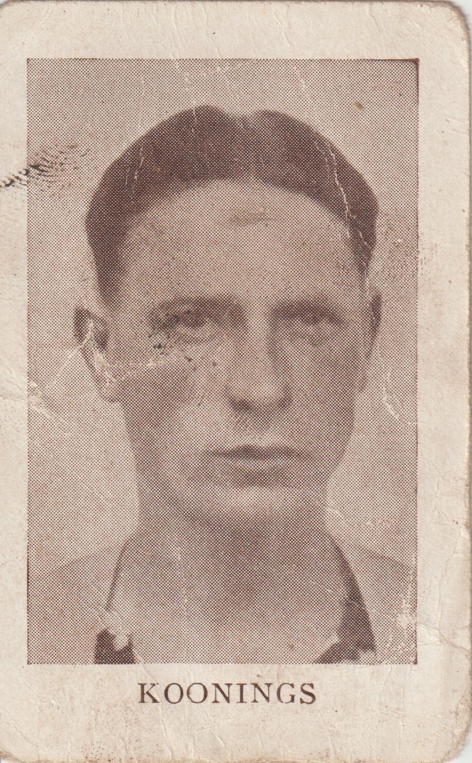 Origineel plaatje van Miss Blanche dat deel uitmaakte van een sportserie van 120 plaatjes. Betreft Koonings, rechtsbinnen van de Rotterdamse voetbalvereniging Feyenoord en tevens ex-International.
