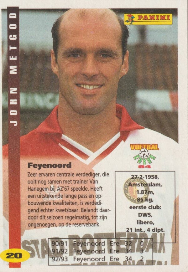 In uitstekende staat verkerend origineel Panini Voetbal 94 kaartje van verdediger John Metgod bij Feyenoord.