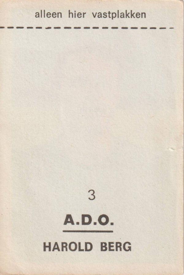 VanderHout Voetbalsterren 1969/1970Type: Plakplaatje#3: Harald Berg (A.D.O.)Op achterzijde is zijn naam destijds verkeerd gespeld, namelijk Harold Berg. Plaatje is niet ingeplakt geweest.