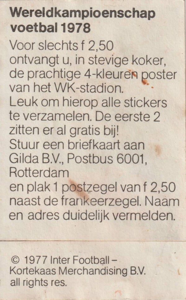 Origineel voetbalplaatje van het merk Inter Footbal uitgegeven door Kortekaas Merchandising BV in 1977. Betreft plaatje van Wim Rijsbergen van het Nederlands Elftal voor het WK 1978.